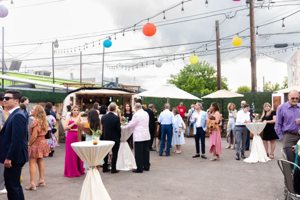 We do provide tables and chairs for your use for up to 200 guests. Our modern wood tables do not require linens but we can help coordinate renting these if you’d like them. We offer a range of decor items like draping and hedge walls to customize your event. All of our bar packages include physical bars and plasticware. We also offer glassware as an optional add-on.